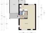 Begane grond: hal/entree met toiletruimte en meterkast, L-vormige woonkamer met open keuken en bijkeuken met doorgang naar de garage.
