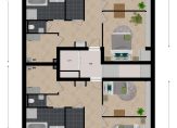 Het complex bestaat uit zes comfortabele appartementen, verdeeld over drie verdiepingen. Elke appartement biedt circa 100 m² woonoppervlakte, een ruime woonkamer met open keuken, twee volwaardige slaapkamers en een balkon/loggia om buiten te zitten. Dankzij de optimale indeling geniet je van licht, ruimte en privacy – of je nu op de begane grond, middenverdieping of bovenste etage woont.