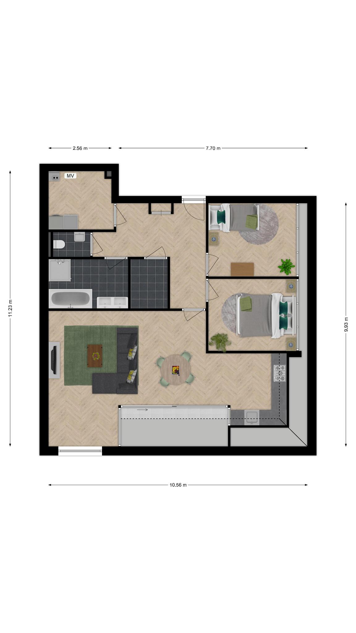 Het complex bestaat uit zes comfortabele appartementen, verdeeld over drie verdiepingen. Elke appartement biedt circa 100 m² woonoppervlakte, een ruime woonkamer met open keuken, twee volwaardige slaapkamers en een balkon/loggia om buiten te zitten. Dankzij de optimale indeling geniet je van licht, ruimte en privacy – of je nu op de begane grond, middenverdieping of bovenste etage woont.