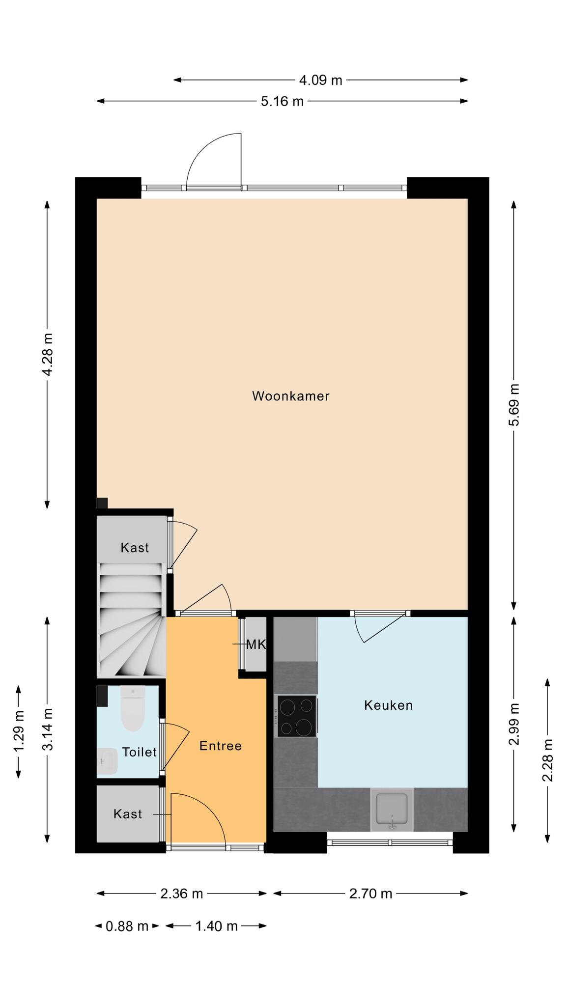De begane grond bestaat uit de hal/entree met toegang tot het toilet en de vaste trap naar de eerste verdieping. Vanuit de hal kom je in de ruime woonkamer die beschikt over veel lichtinval en die aansluit op de open keuken. De open keuken is voorzien van inbouwapparatuur en biedt veel opbergruimte. De begane grond is voorzien van vloerverwarming.