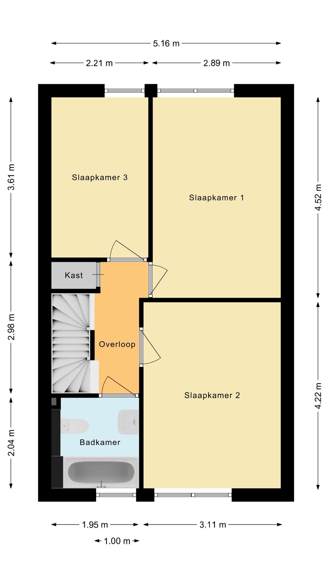 Op de eerste verdieping bevinden zich drie ruime slaapkamers. Deze verdieping is ook voorzien van een badkamer met een ligbad, toilet en een wastafelmeubel.