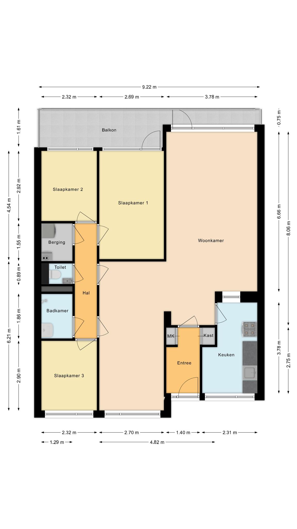 Entree/hal, meterkast, vaste kast, royale woonkamer met toegang tot het balkon en een eetgedeelte, en dichte keuken. Via de tussenhal bereik je drie slaapkamers, waarvan één met toegang tot het balkon. Daarnaast biedt de tussenhal toegang tot het separate toilet, de badkamer, en een berging met de cv-installatie.