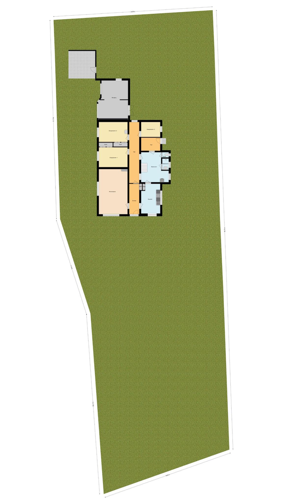 Bij binnenkomst tref je een ruime hal/entree. De woning beschikt over een separate keuken, een royale woonkamer en diverse functionele ruimtes zoals een bijkeuken, toilet en douche. Op de begane grond bevinden zich bovendien drie slaapkamers, waarmee deze woning levensloopbestendig is ingericht.