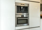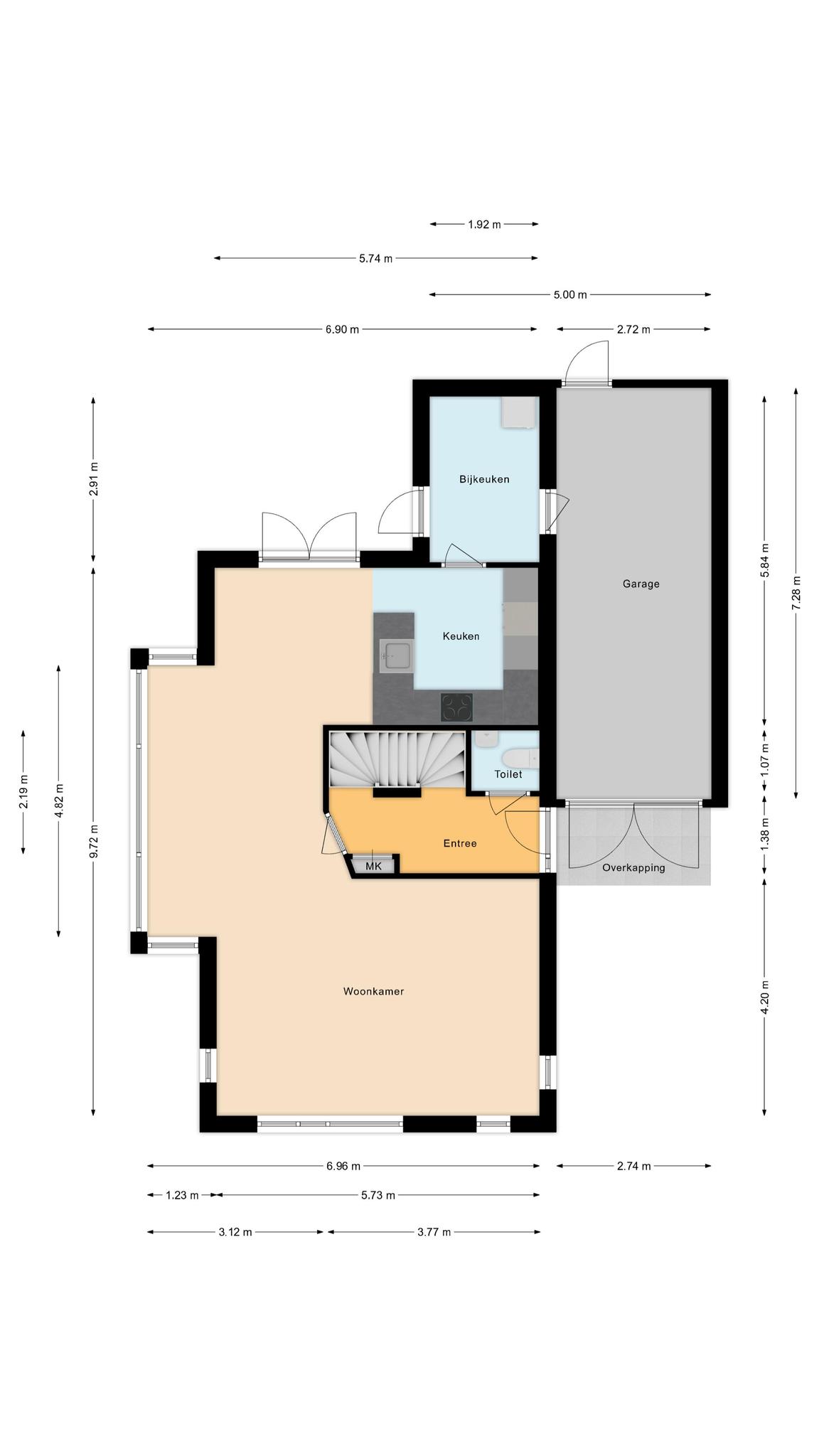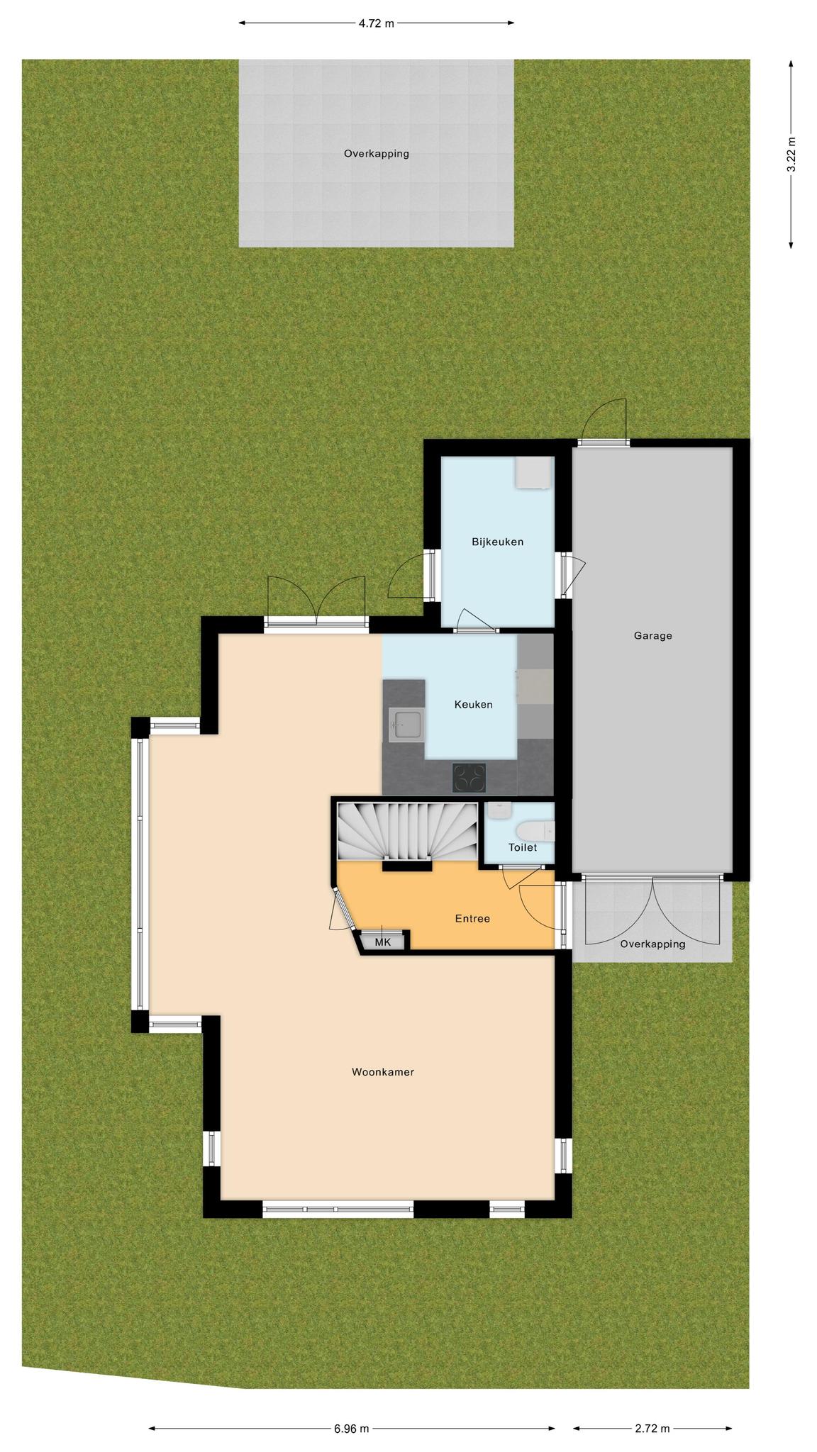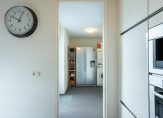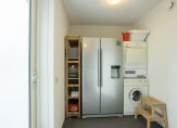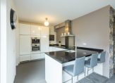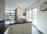 Via de hal/entree bereik je de moderne L-vormige woonkamer, via de openslaande deuren of de bijkeuken kom je uit in de prachtige tuin. De stijlvolle keuken met schiereiland is van alle gemakken voorzien, inclusief hoogwaardige inbouwapparatuur van A-merken. In de bijkeuken vind je handige aansluitingen voor de onder andere een wasmachine. De begane grond is voorzien van vloerverwarming.