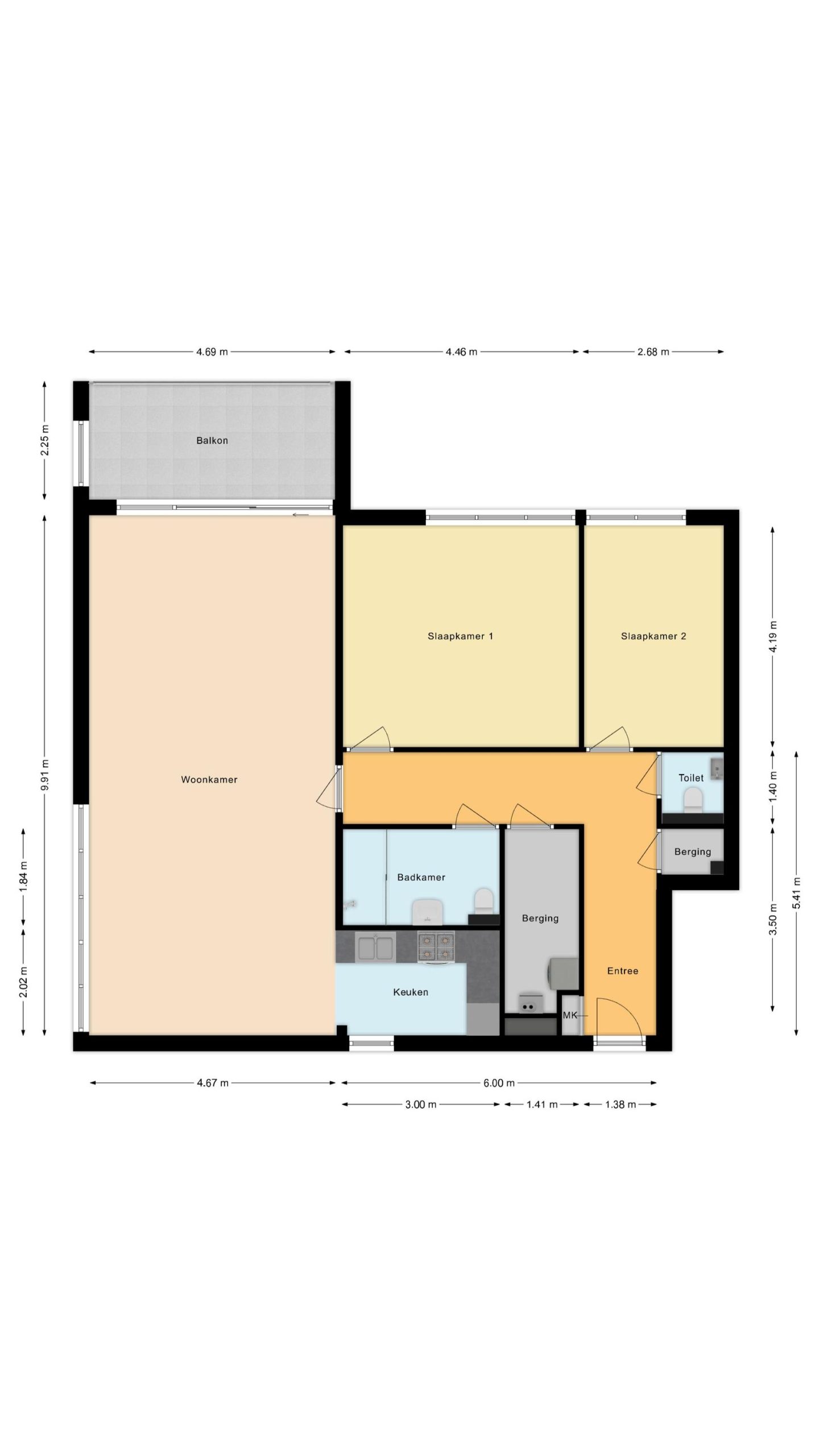 De hal biedt toegang tot een inpandige berging en een toilet. De ruime, lichte woonkamer heeft grote raampartijen en directe toegang tot het zonnige balkon op het zuidwesten, waar u geniet van een vrij uitzicht op de aangrenzende groenstrook. De open keuken is voorzien van diverse inbouwapparatuur. Verder zijn er twee slaapkamers en een badkamer met tweede toilet, douche en wastafelmeubel.