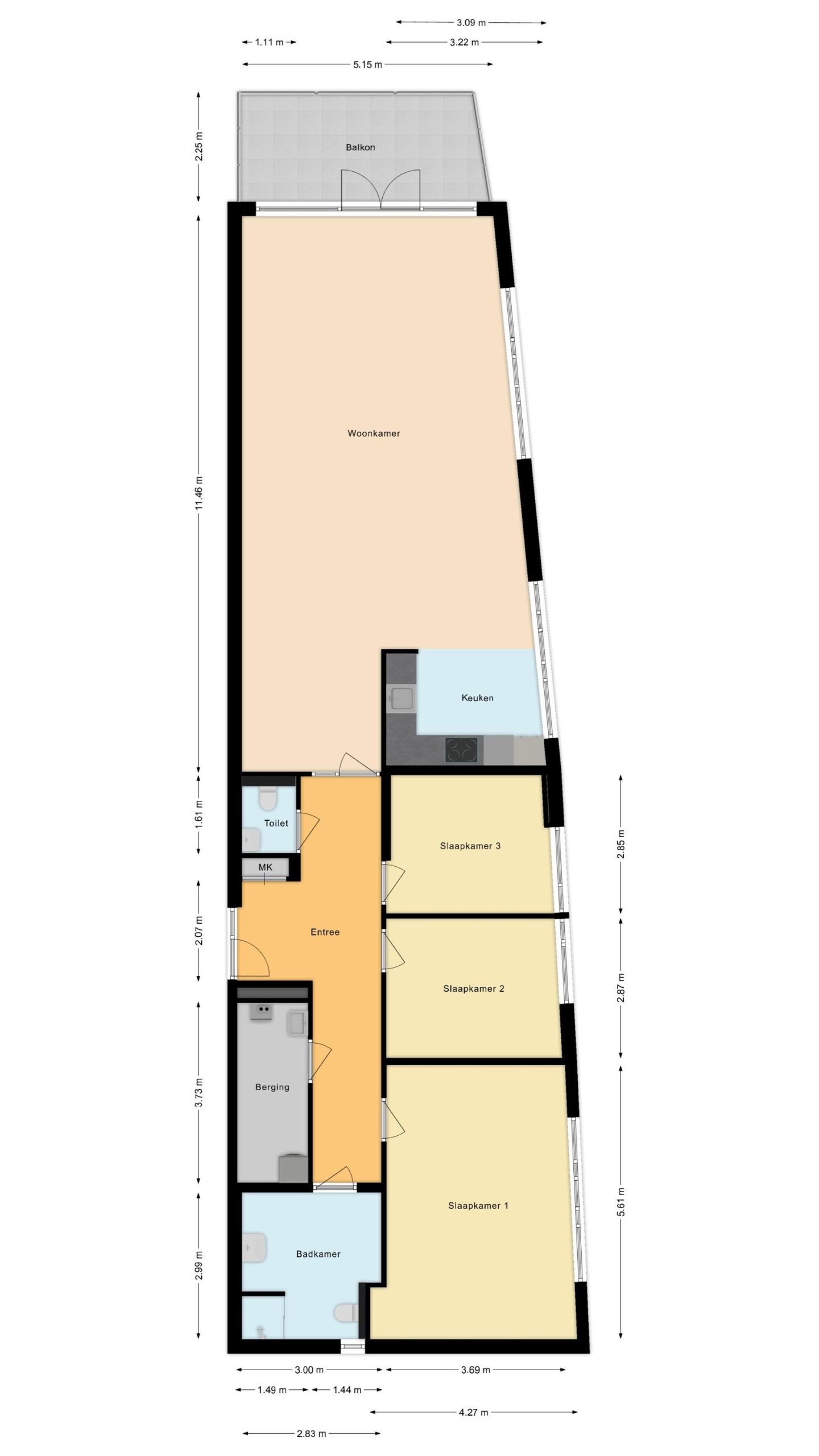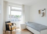 Entree/hal met toegang tot toiletruimte en berging. Drie volwaardige slaapkamers, waarvan één ideaal als werkkamer. Lichte woonkamer met grote ramen en veel daglicht. Open keukenruimte. Moderne badkamer voorzien van douche, wastafel en toilet.