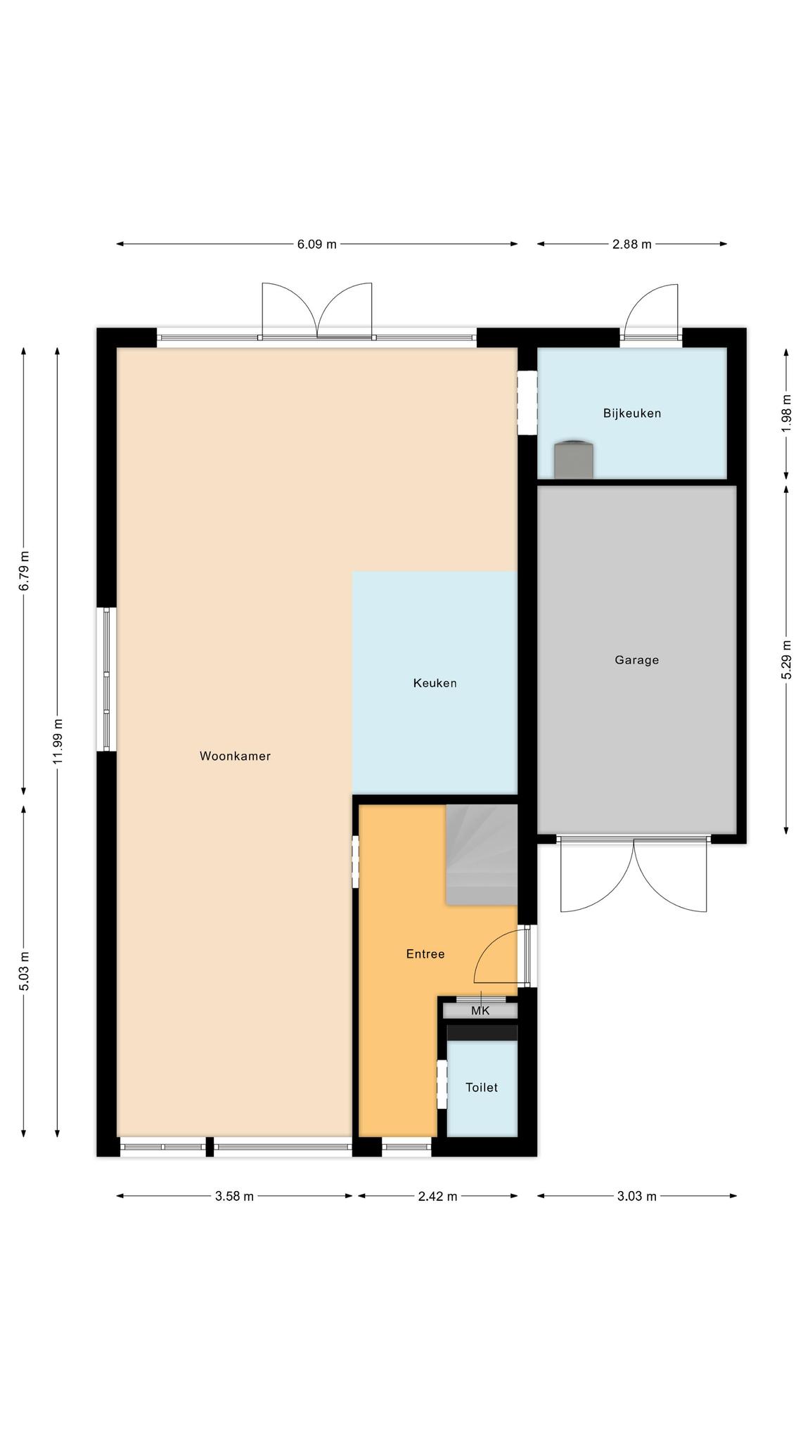 Entree/hal met toiletruimte (frame aanwezig), lichte doorzonwoonkamer en open keukenruimte. De keuken dient nog geplaatst te worden, wat volop vrijheid biedt in stijl en indeling.