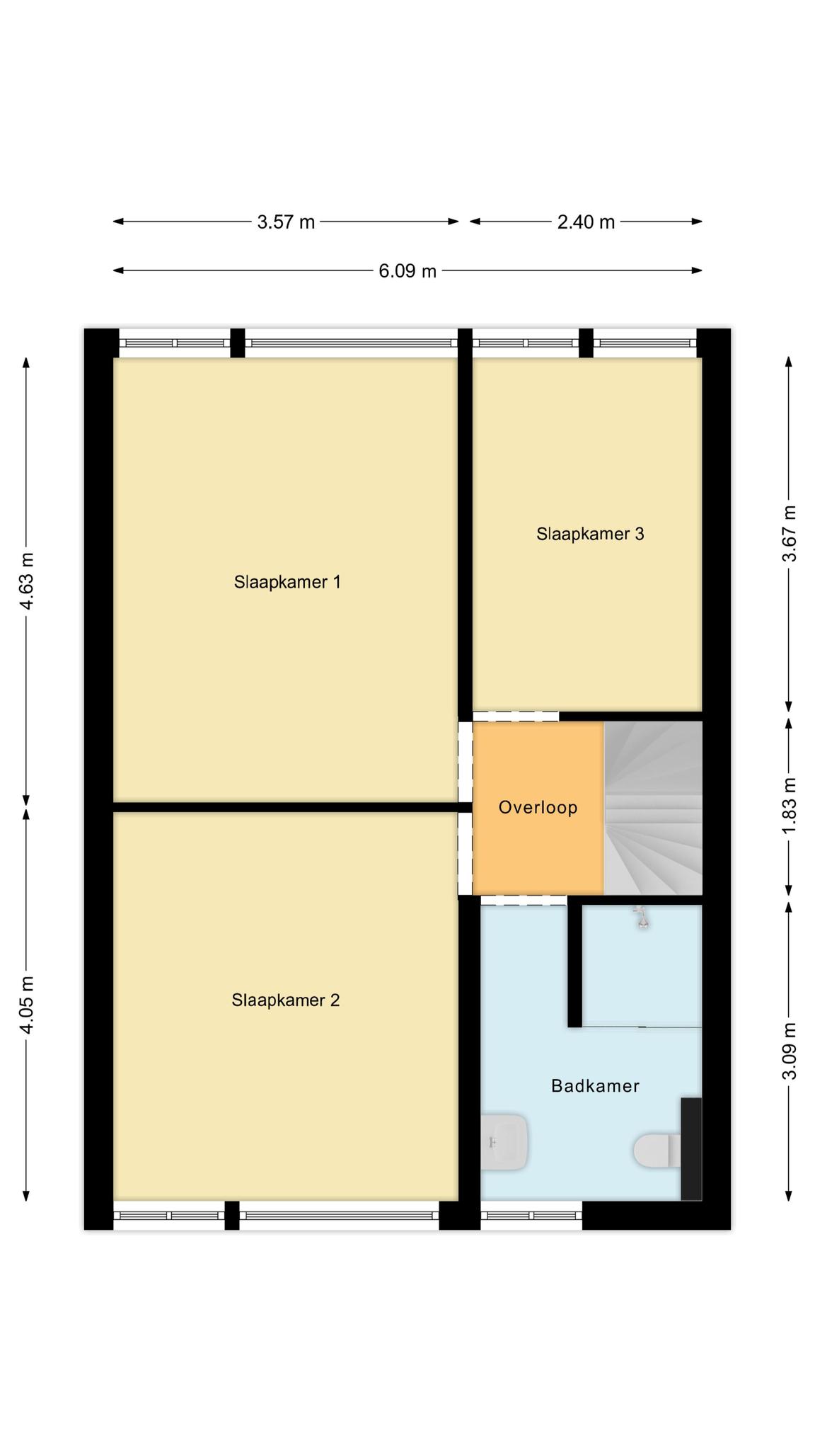 Overloop, drie slaapkamers en een badkamer (alle aansluitingen aanwezig – nog te realiseren naar eigen wens).