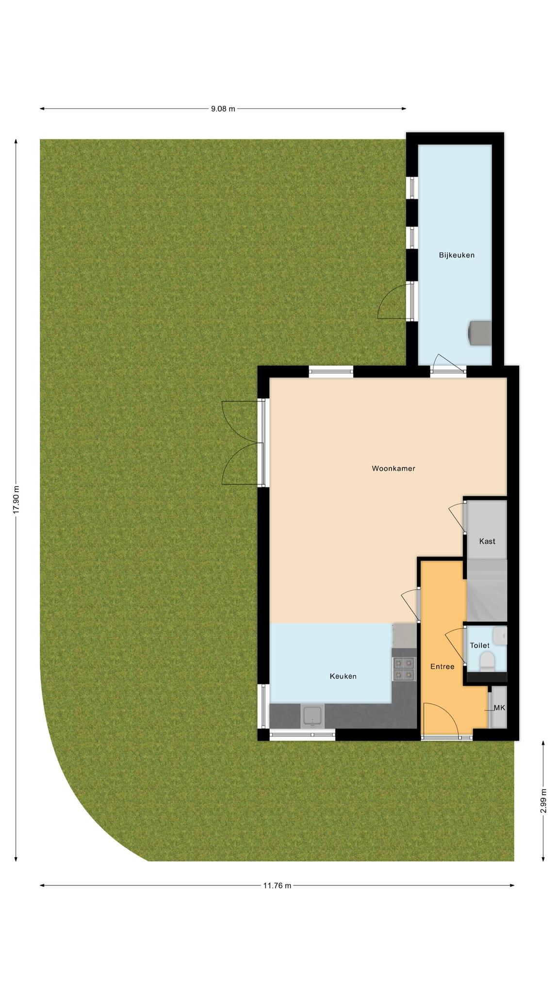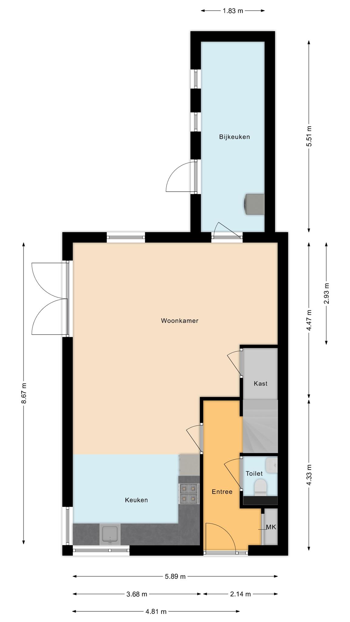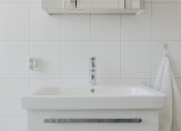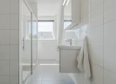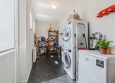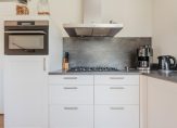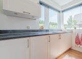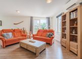 Binnenkomst via een nette hal met toegang tot het moderne toilet. De lichte woonkamer is voorzien van een airco-/verwarmingsunit en staat in open verbinding met de moderne keuken in lichte kleurstelling, compleet met inbouwapparatuur. Via de bijkeuken, waar zich ook de wasmachineaansluiting bevindt, is de tuin bereikbaar.