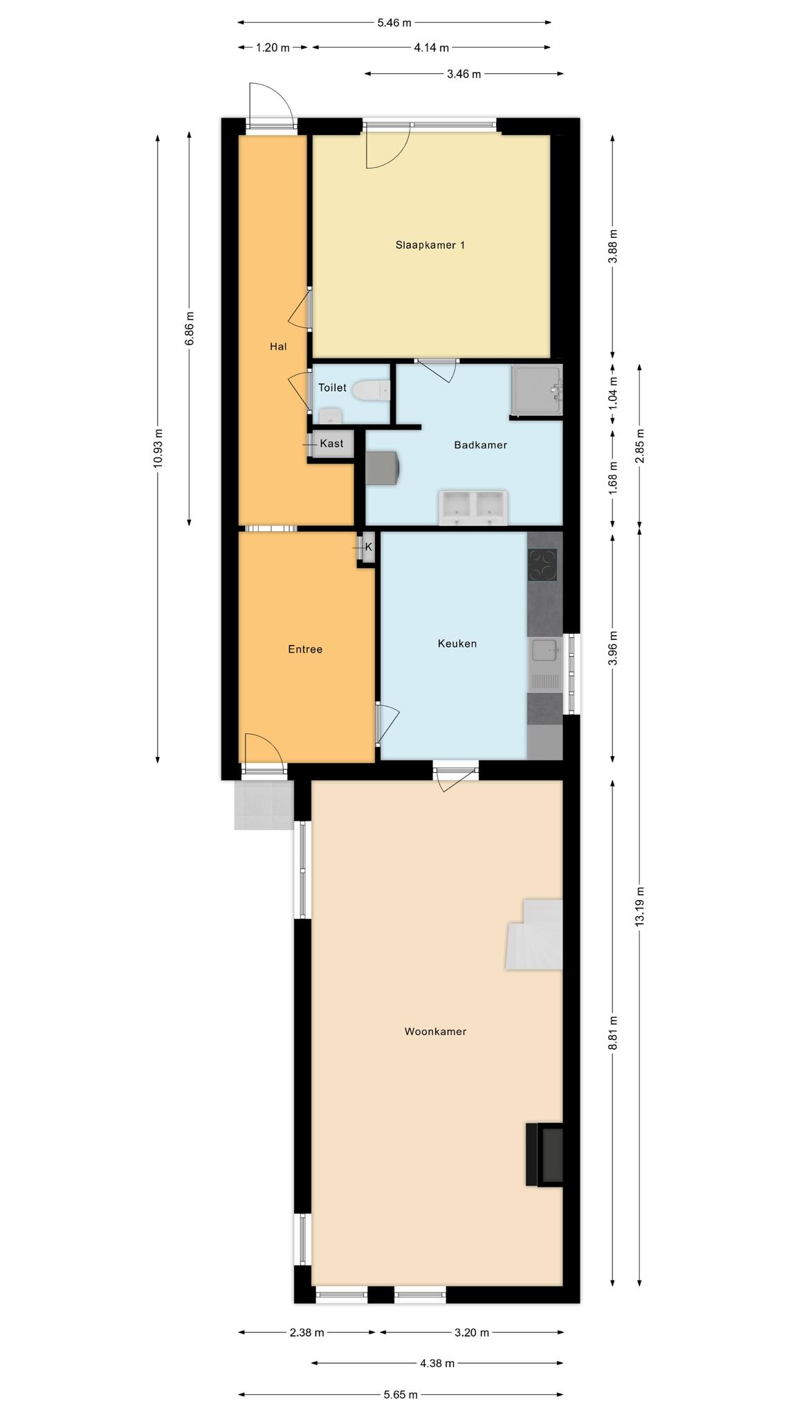 Bij binnenkomst via de entree/hal heb je toegang tot de keuken en de slaapkamer op de begane grond. De keuken is verbonden aan de woonkamer, in de woonkamer bevinden zich prachtige blikvangers, de hoge plafonds met ornamenten en een sfeervolle open haard zijn echte eyecatchers. Aangrenzend aan de slaapkamer bevindt zich een badkamer met dubbele wastafel en douche.