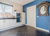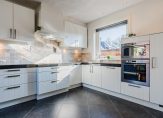 Bij binnenkomst tref je een ruime hal met toilet, trapopgang en trapkast. De sfeervolle L-vormige woonkamer biedt veel lichtinval en ruimte. De aangrenzende woonkeuken is voorzien van inbouwapparatuur en een schuifpui die toegang geeft tot de overkapping. Vanuit hier bereik je tevens de kantoorruimte, ideaal voor thuiswerken.