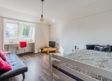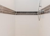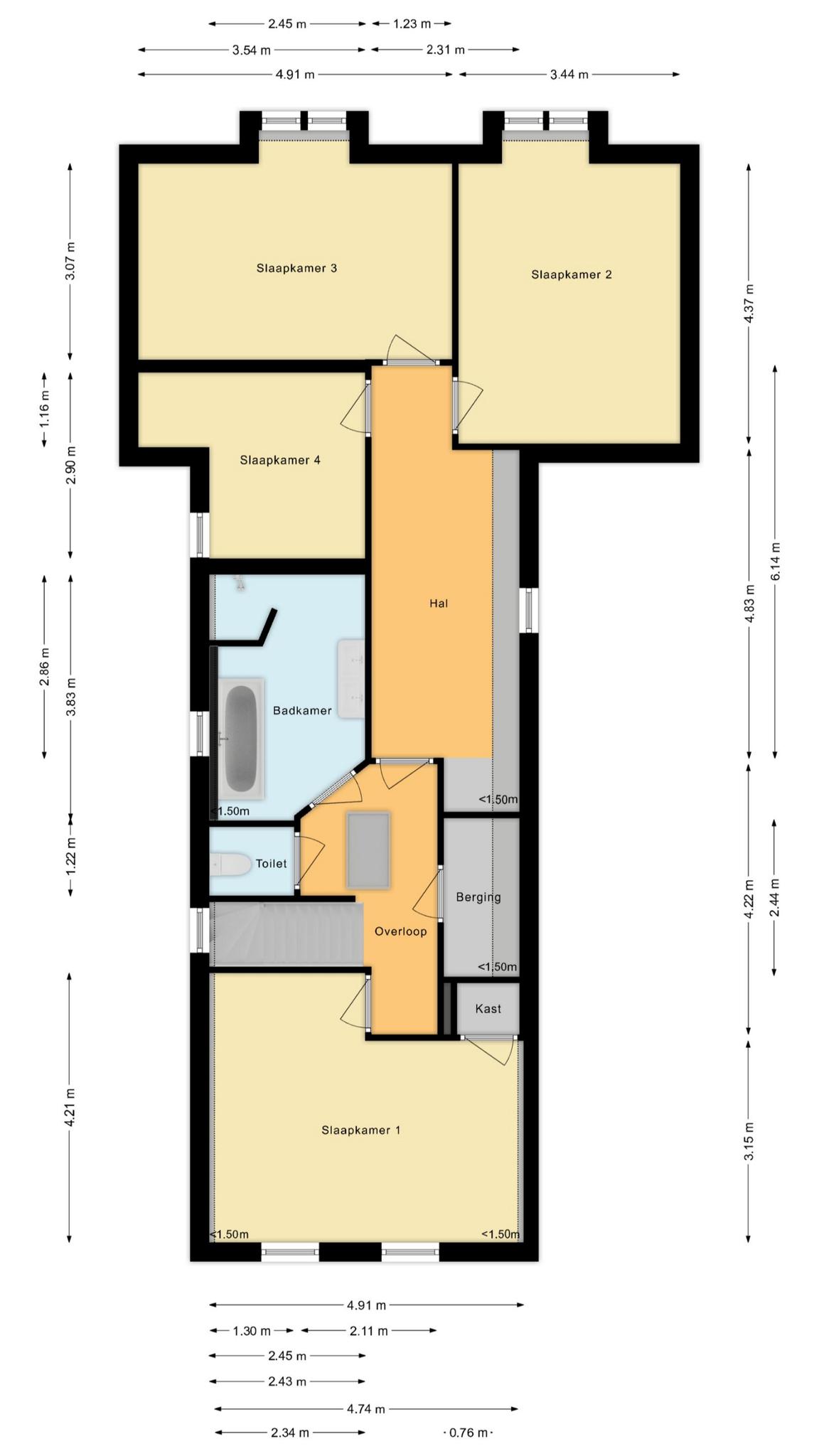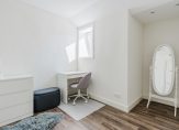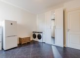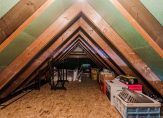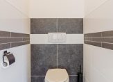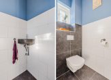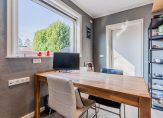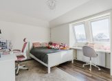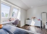 De overloop geeft toegang tot drie slaapkamers, een vaste kastenwand en een separate toiletruimte. De royale hoofdslaapkamer strekt zich uit over de volledige breedte van de woning. De moderne badkamer is uitgerust met een ligbad, dubbele wastafel en een inloopdouche. Een vlizotrap leidt naar de praktische vliering.