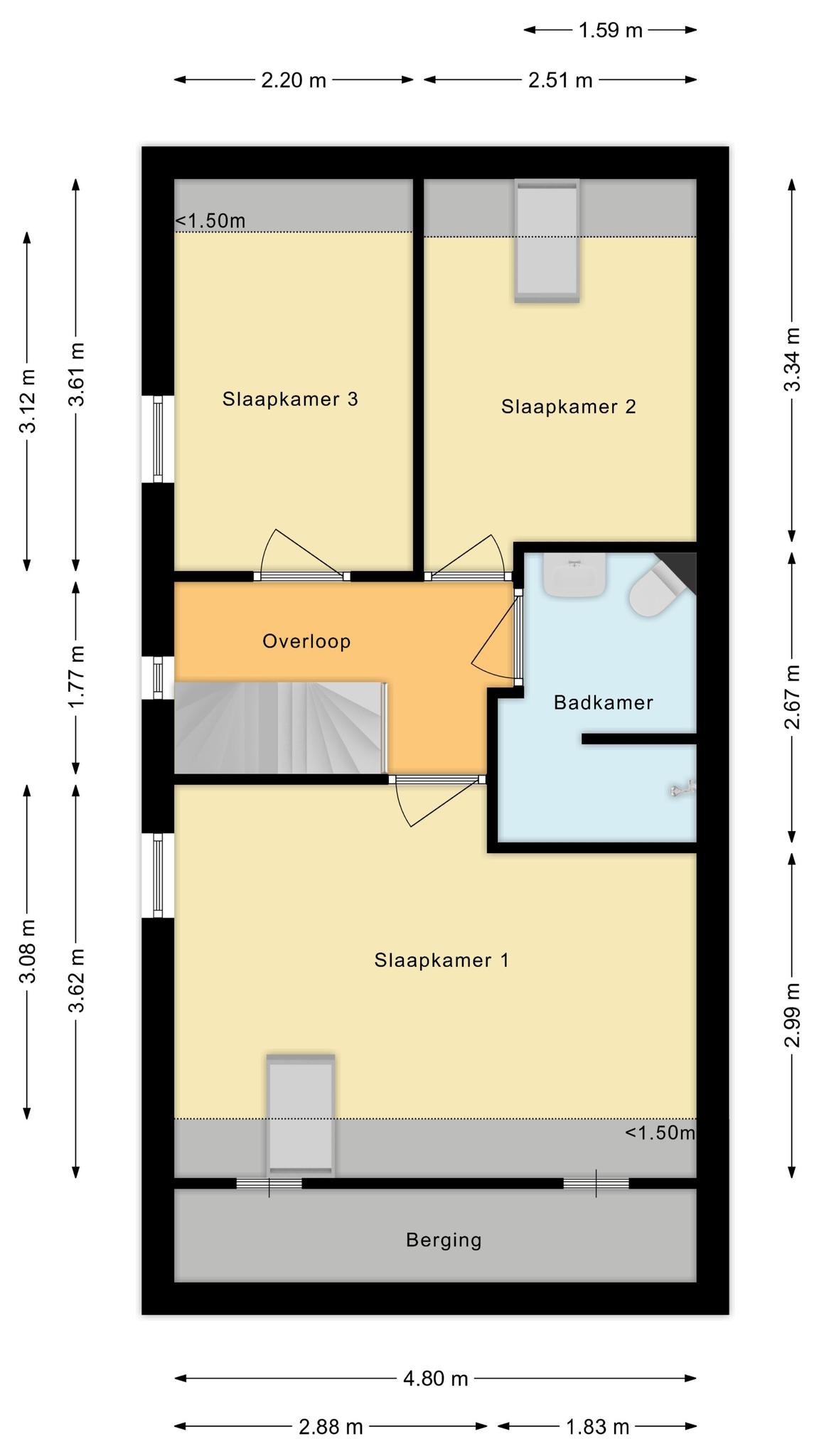 Op de eerste verdieping bevinden zich drie slaapkamers en een moderne badkamer. De badkamer is voorzien van een inloopdouche, een tweede toilet en een praktisch badmeubel, waardoor je hier comfortabel van alle gemakken kunt genieten.