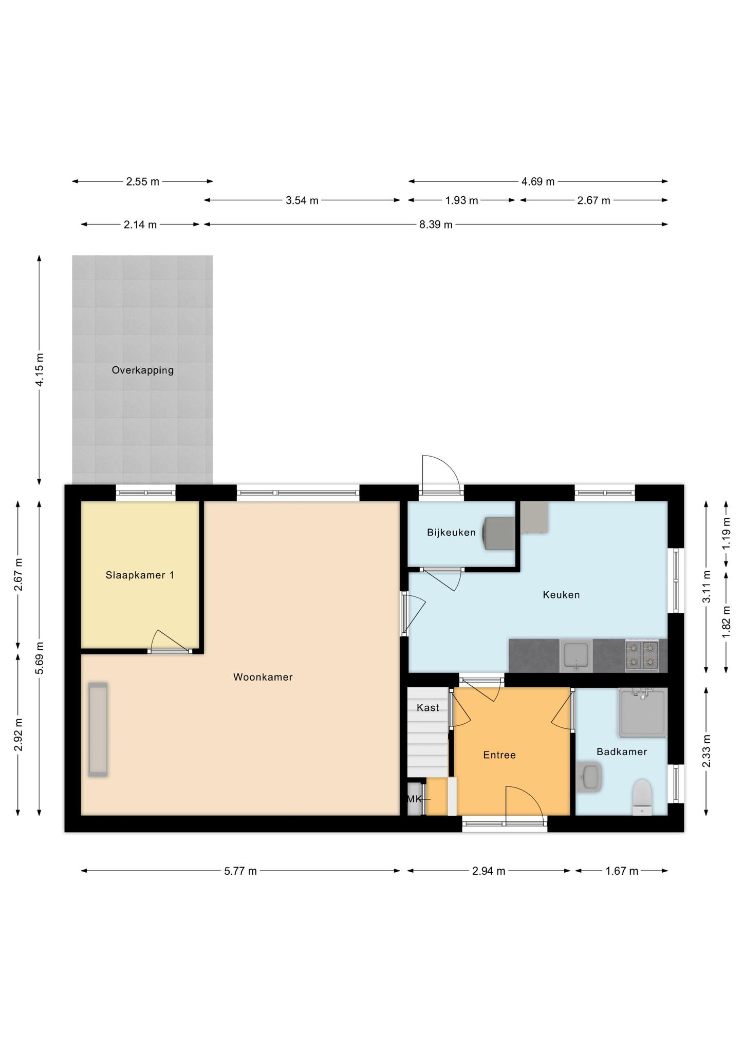 Hal/entree, toilet, doucheruimte, keuken, L-vormige woonkamer en slaapkamer.