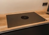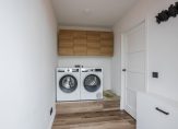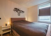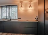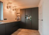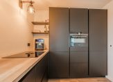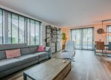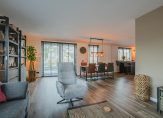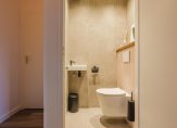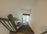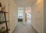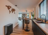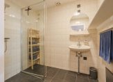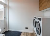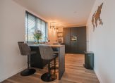 De hal biedt toegang tot het toilet en de lichte woonkamer, die dankzij de schuifpui direct toegang geeft tot het zonnige terras. De moderne open keuken is voorzien van hoogwaardige inbouwapparatuur (2021), waaronder een inductiekookplaat met geïntegreerde afzuiging. De keuken grenst aan de bijkeuken, die ruimte biedt voor de wasmachine en extra opslag. Op de begane grond bevindt zich ook een slaapkamer met een eigen badkamer, ideaal voor levensloopbestendig wonen.
