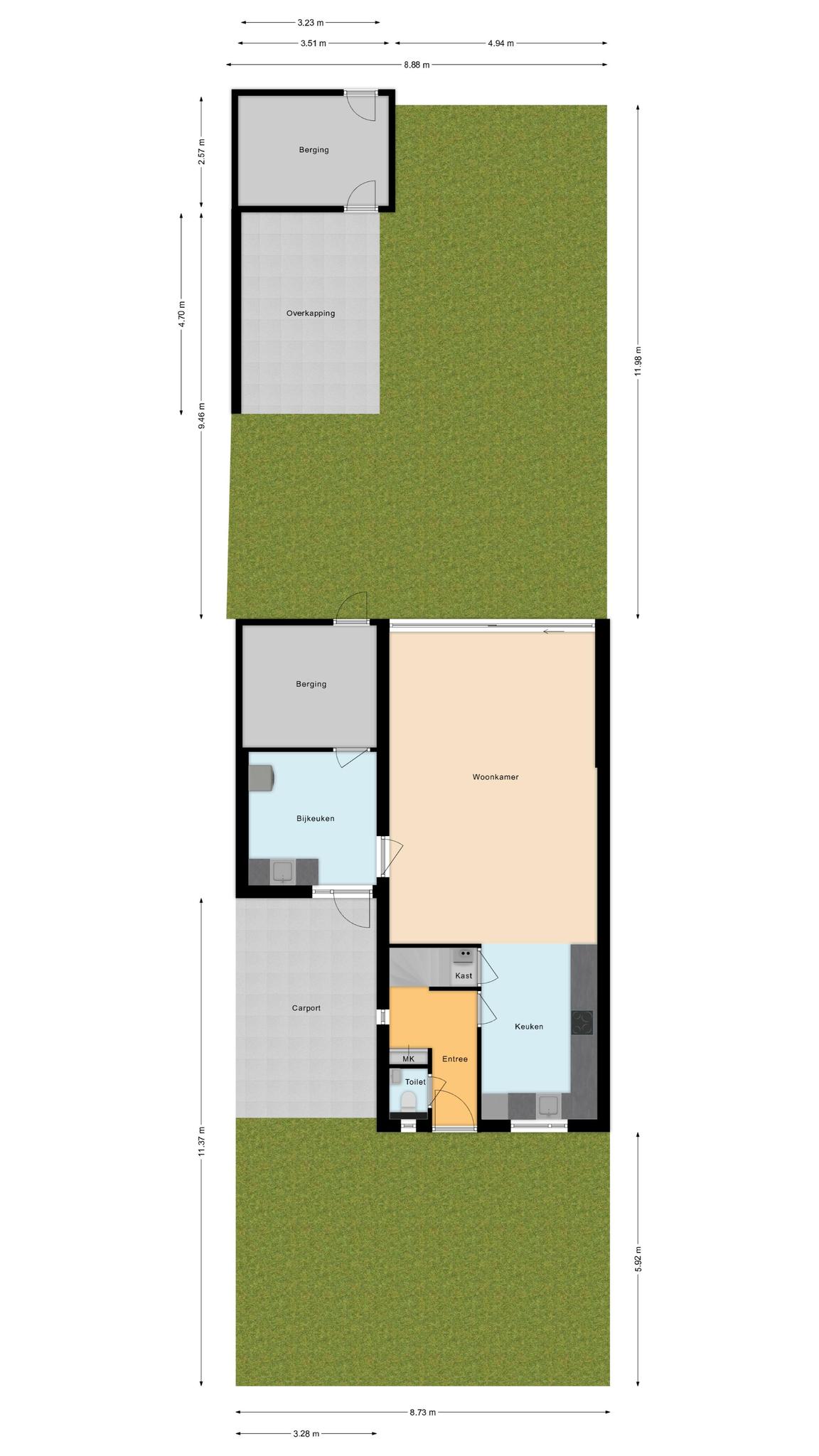 Je komt binnen in de hal met een toilet. De moderne keuken is voorzien van alle inbouwapparatuur. Een ruim uitgebouwde woonkamer met een schuifpui naar het zonneterras. Verder is de begane grond voorzien van een bijkeuken en berging.