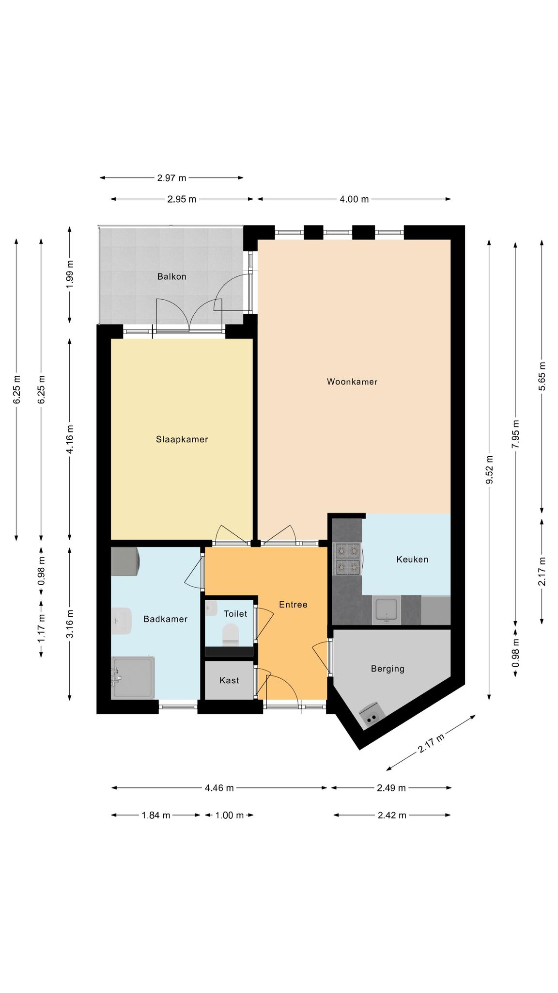 Via de hal/entree heb je toegang tot het toilet. De lichte woonkamer en open keuken bieden veel ruimte en sfeer. De slaapkamer heeft openslaande deuren naar het terras. De badkamer is voorzien van een douche, vaste wastafel en een wasmachineaansluiting. Daarnaast is er een praktische inpandige berging aanwezig.