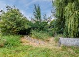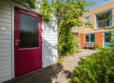 Achterin de tuin bevindt zich een houten schuur met elektriciteitsvoorziening en een achterom met afsluitbare deur. De achterzijde is begroeid met een prachtige blauwe regen en een smakelijke druif.