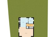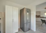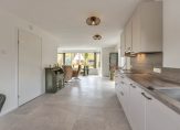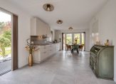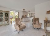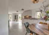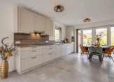 Entree, toilet, keuken met openslaande deuren naar zonneterras, bijkeuken en royale woonkamer.