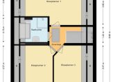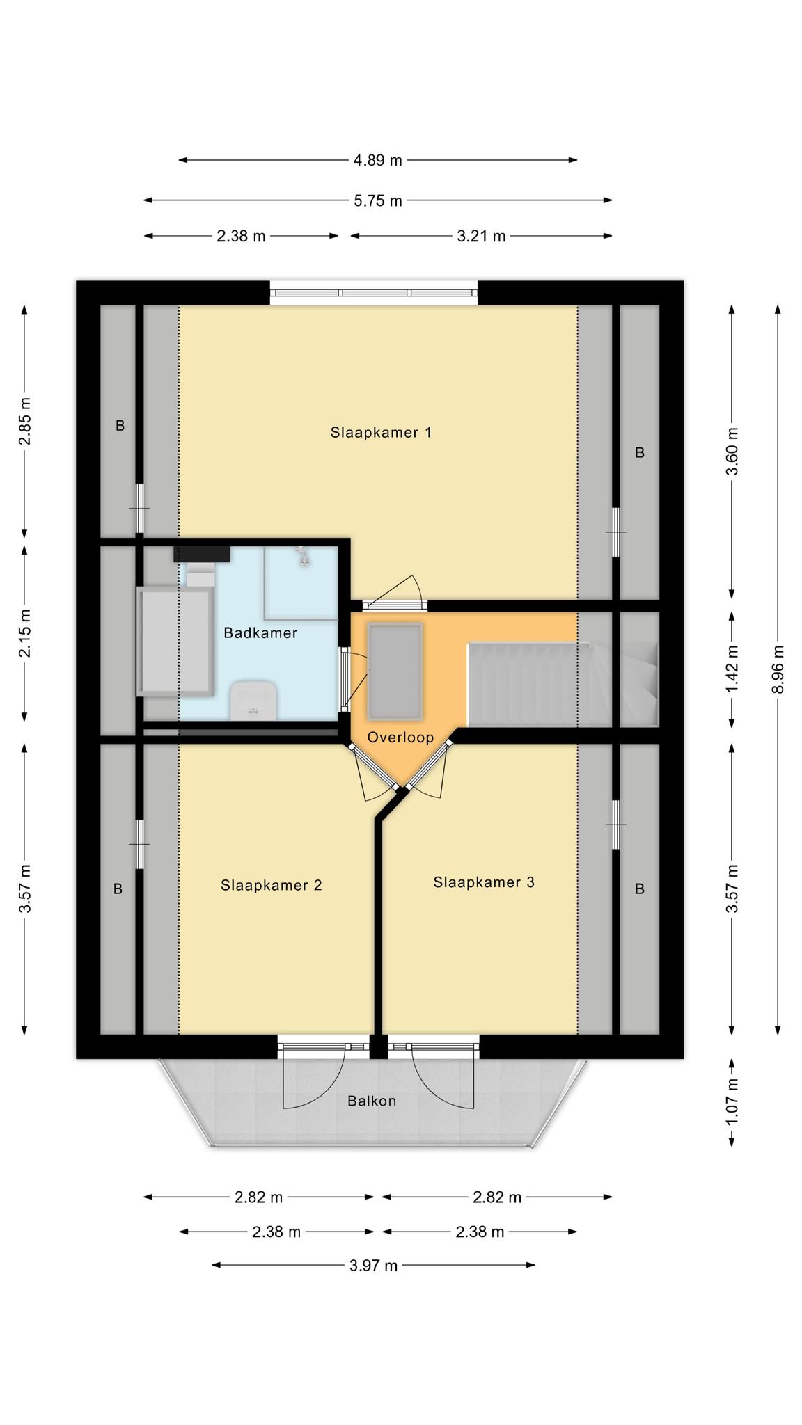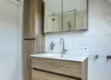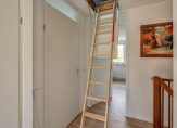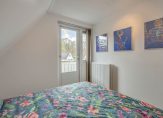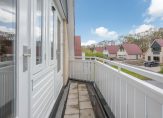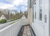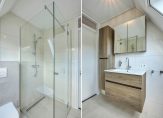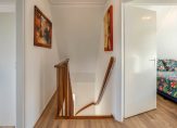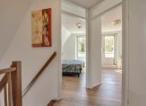 Overloop, moderne badkamer en drie slaapkamers, waarvan twee met gedeeld balkon.