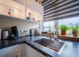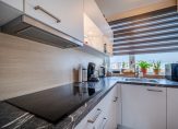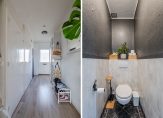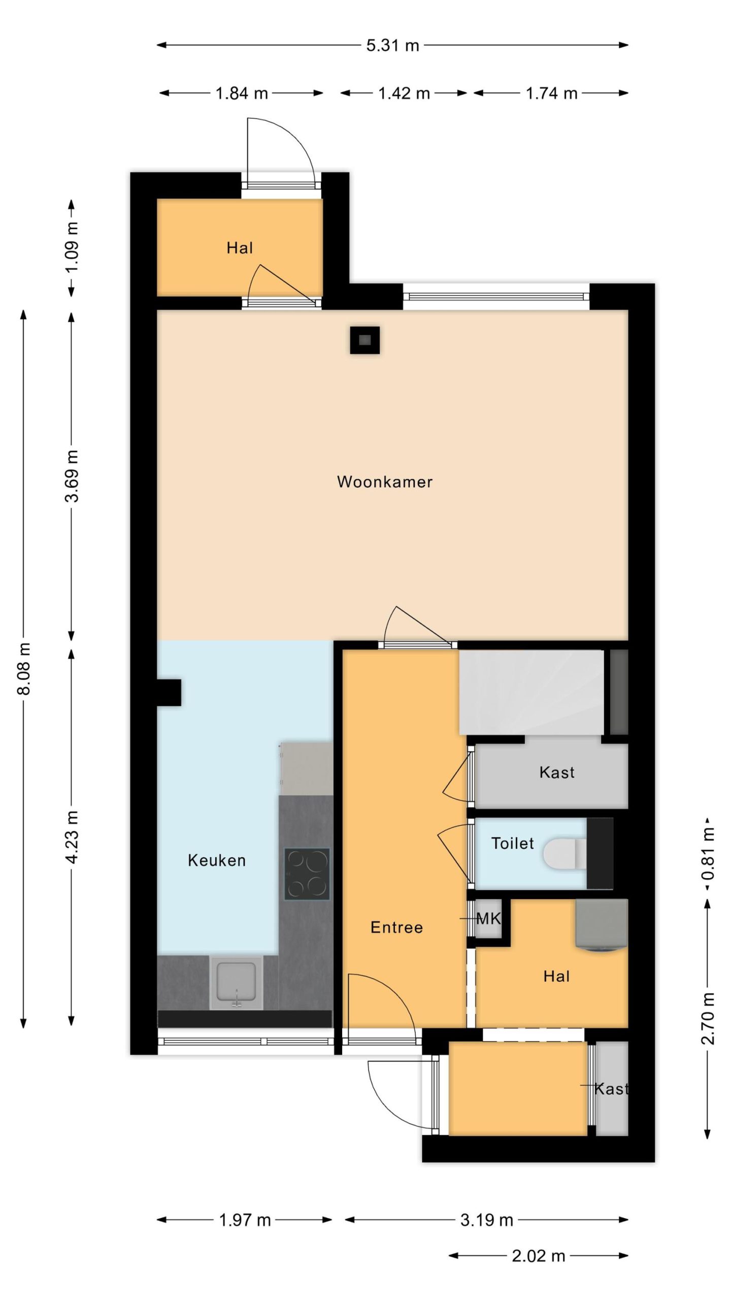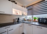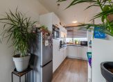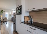 Hal/entree met bijkeuken, provisiekast, toilet, woonkamer, halfopen keuken met moderne keukeninrichting (2023) in lichtekleurstelling met inbouwapparatuur. De gehele begane grond is keurig afgewerkt met laminaat.