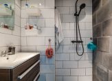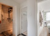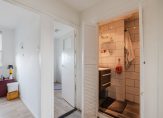 Overloop met een bergruimte, 4 slaapkamers en een badkamer met douche en wastafelmeubel.