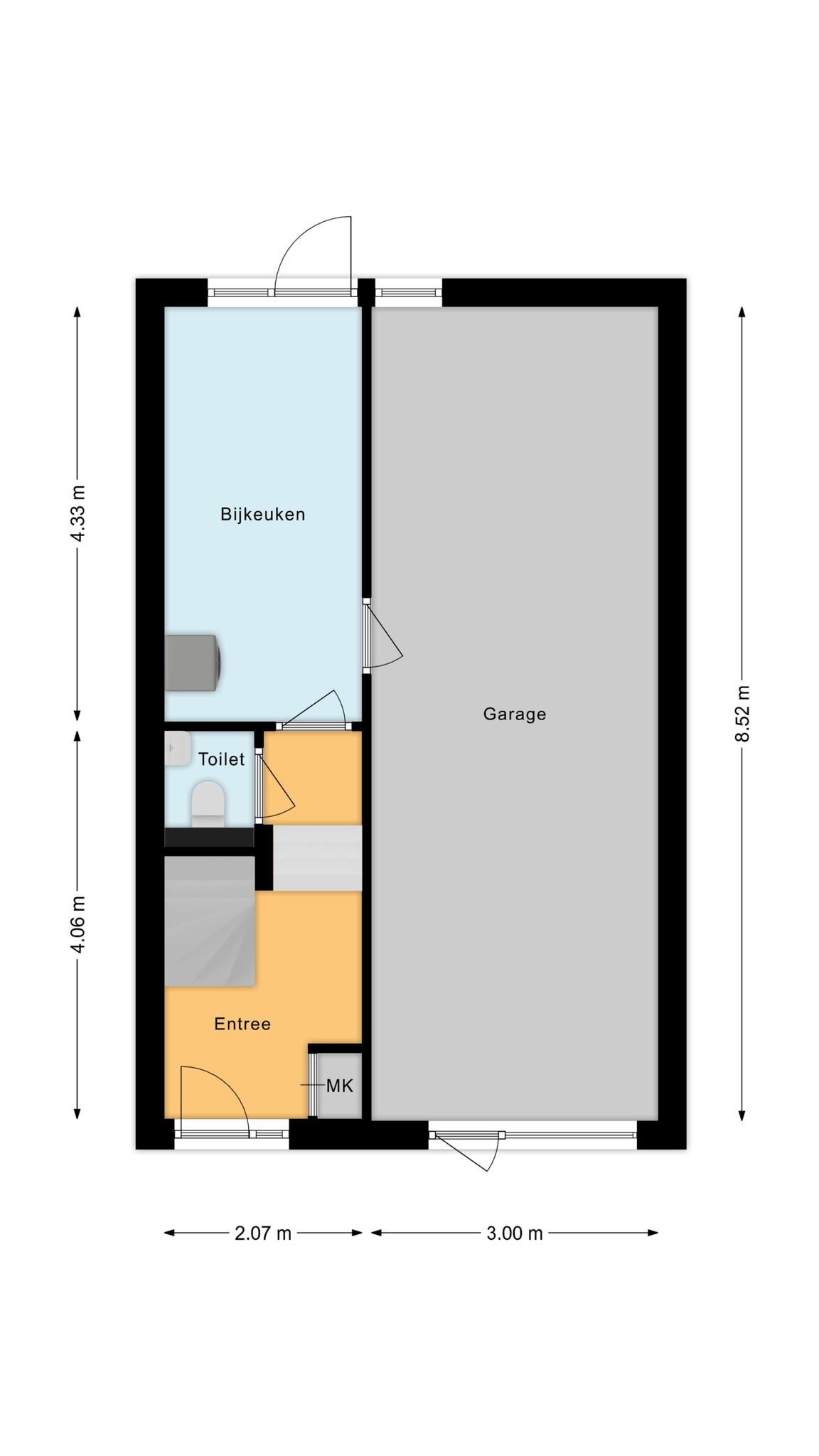 Je komt binnen in de hal/entree en die is voorzien van een toilet, trapopgang en toegang tot het souterrain. Hier vind je een bijkeuken/berging met wasmachineaansluiting, een tuindeur, een extra kamer en een garage van 6 meter diep. De kamer, momenteel in gebruik als berging, biedt veelzijdige mogelijkheden zoals een badkamer, praktijkruimte of hobbykamer.