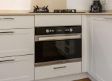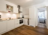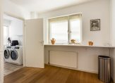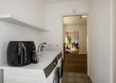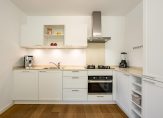 Aan de achterzijde op de beneden verdieping bevindt zich een moderne, lichte open keuken voorzien van diverse inbouwapparatuur met doorgang naar de bijkeuken. De beneden verdieping beschikt over een echte eiken vloer.