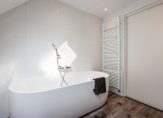 Op de eerste verdieping bevinden zich twee slaapkamers, waarvan één slaapkamer met inbouwkasten en een badkamer met ligbad die is vernieuwd en gemoderniseerd in 2020. Middels een vlizotrap is de vliering bereikbaar, waar je tevens in het midden ook kan staan.