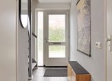 Entree, toilet, meterkast, lichte L-vormige woonkamer met open keuken voorzien van inbouwapparatuur en bijkeuken.