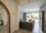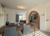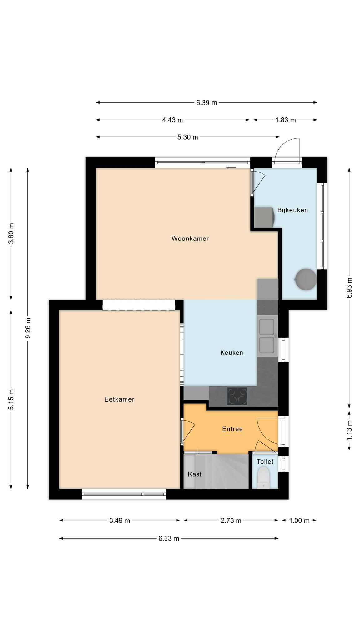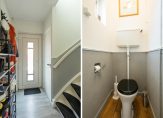 Je komt binnen in de hal/entree, waar je toegang hebt tot het toilet, de vaste trap naar de eerste verdieping en de doorgang naar de eetkamer. De eetkamer vormt het hart van de woning en biedt doorgang naar zowel de woonkamer als de open keuken. De ruime woonkamer is voorzien van een grote raampartij met schuifpui naar het zonneterras, wat zorgt voor een prachtig lichtinval en een directe verbinding met de tuin. Vanuit de woonkamer heb je ook toegang tot de bijkeuken, een praktische ruimte voor extra opslag en voorzieningen.