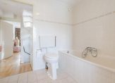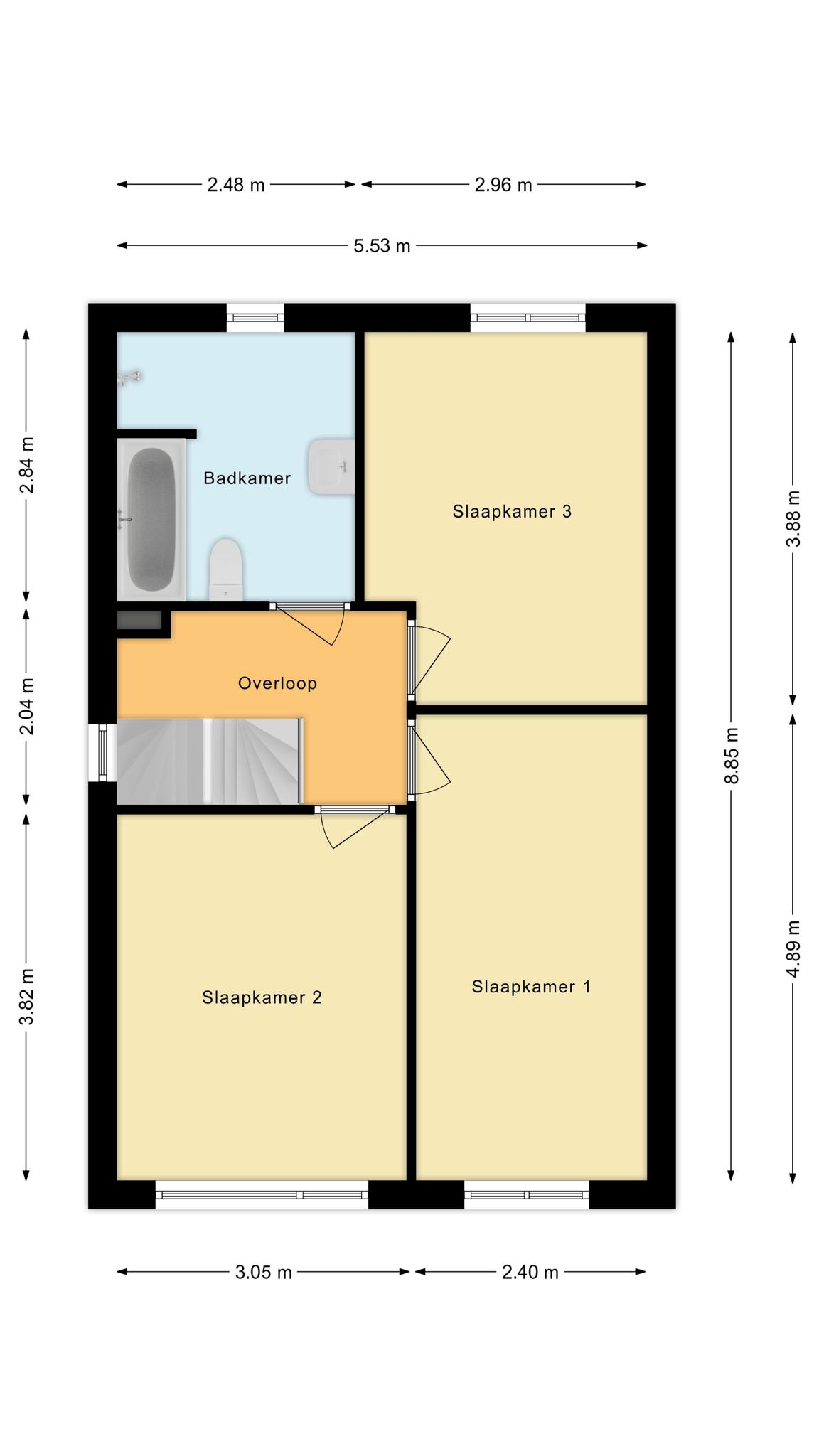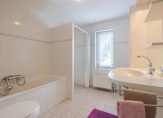 Op de eerste verdieping vind je drie slaapkamers. De badkamer is compleet ingericht met een ligbad, douche, wastafelmeubel en een tweede toilet.