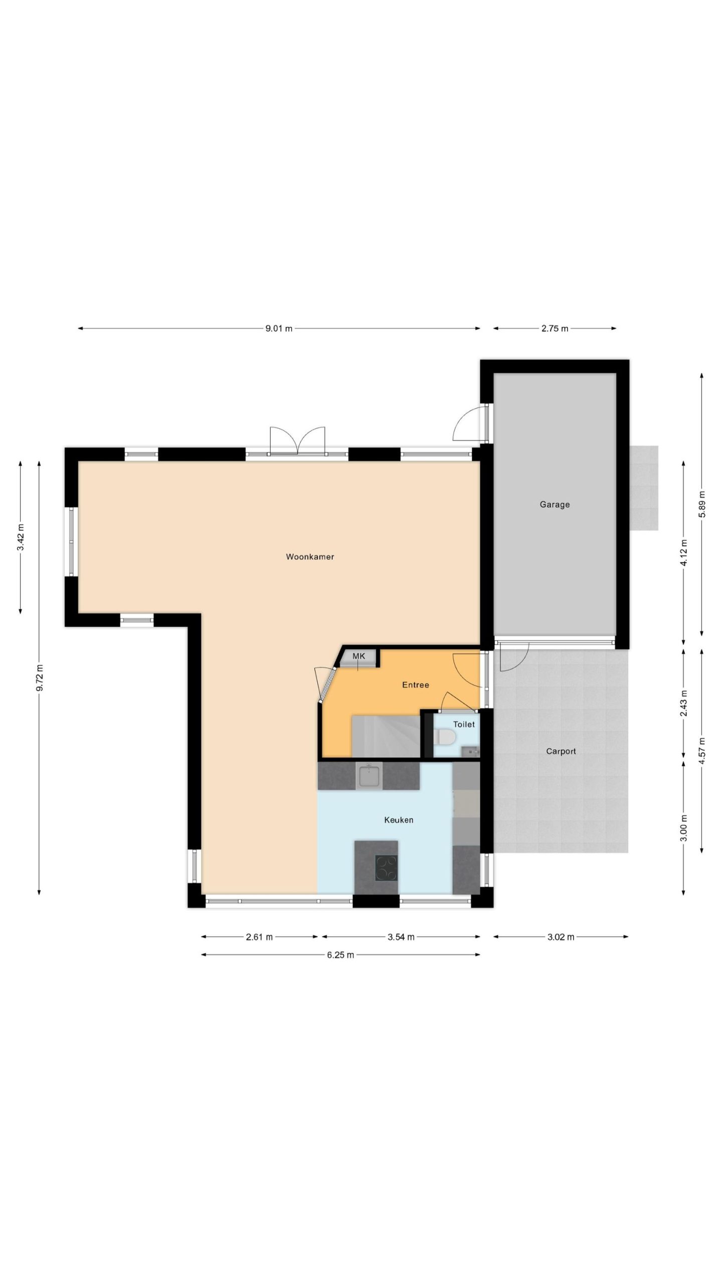 Via de entree/hal met toilet en trapopgang betreedt u de ruime T-woonkamer met veel raampartijen die zorgen voor een lichte en prettige leefruimte. De open keuken is voorzien van diverse inbouwapparatuur en een praktisch schiereiland.